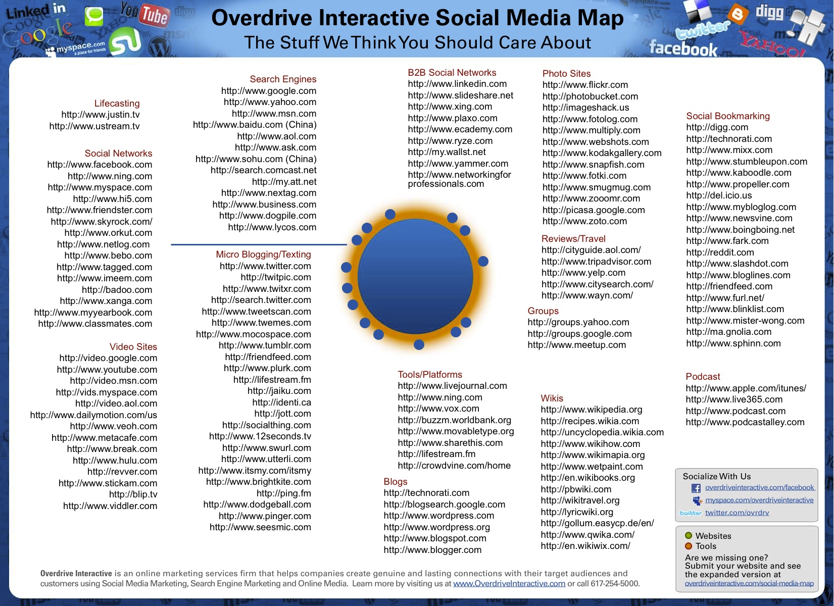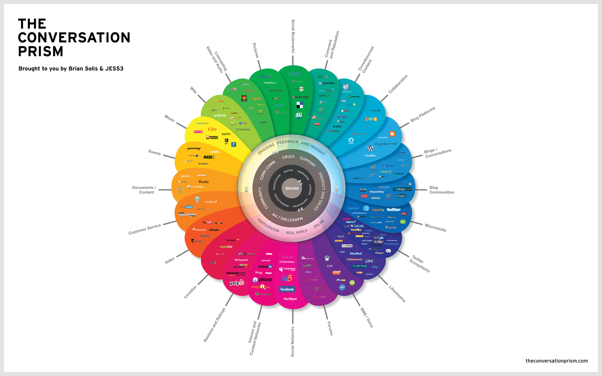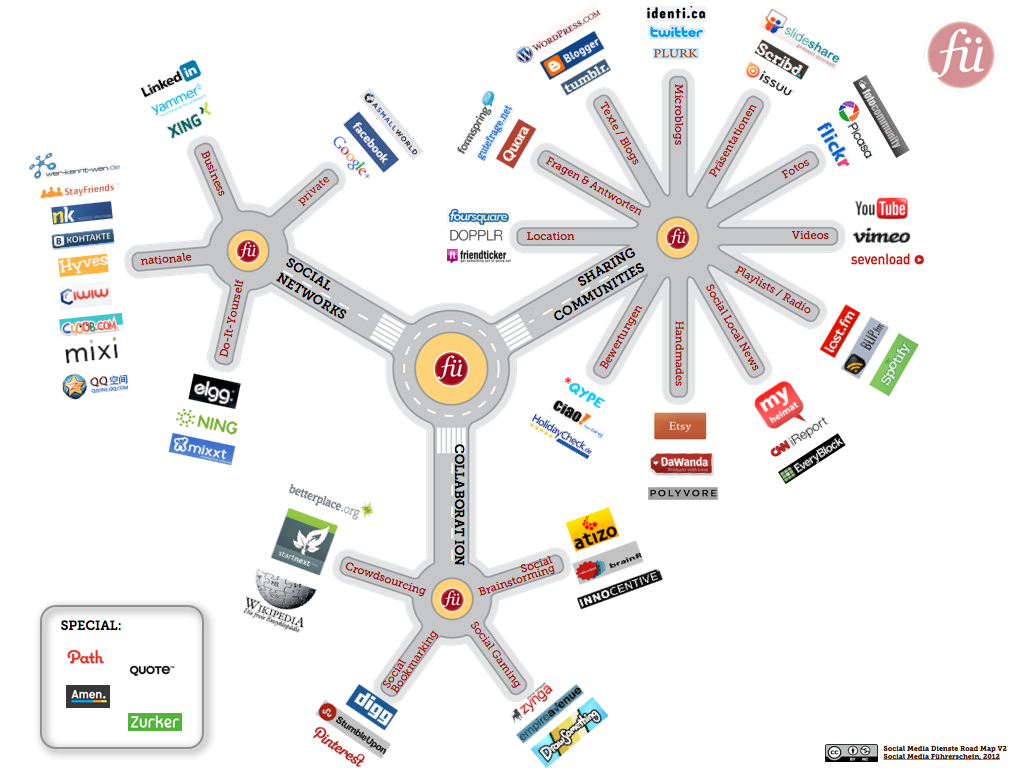 Im Laufe der Zeit (Recherchen) sind wir auf viele Social Media Maps oder auch Landschaftsabbildungen der Social Media Dienste und Netzwerke gestossen, die inzwischen schon Klassikerstatus besitzen. Einige der Darstellungen werden regelmäßig aktualisiert, andere haben ihre Gültigkeit trotz hoher Dynamik im App und Plattform Markt nicht verloren. Quellen und Credtits findet ihr direkt in den Abbildungen.