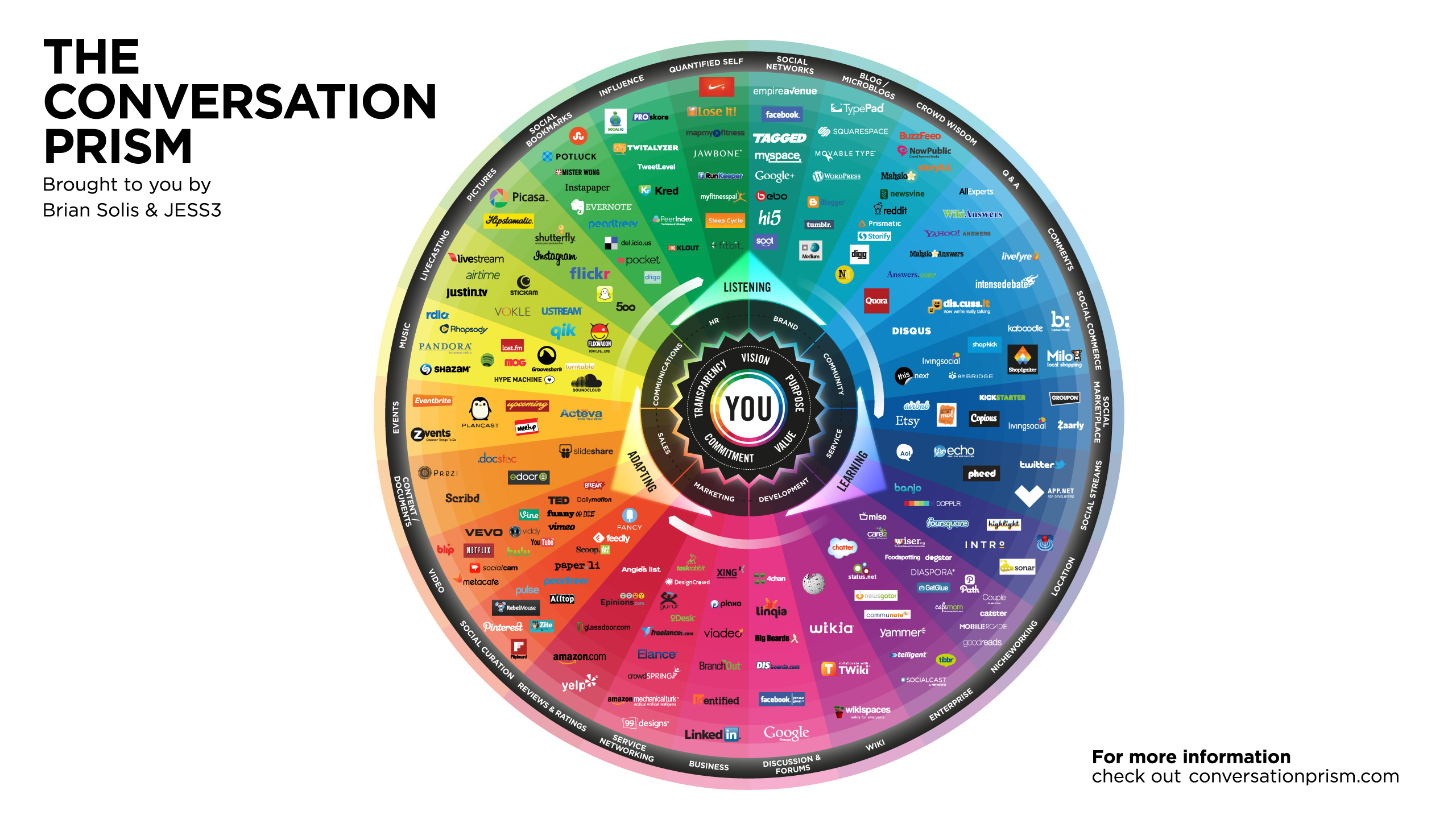 Vorbild für diese Art der Darstellung ist die Conversation Prism vom US-Amerikanischen Social Media Strategen Brian Solis, die er bereits seit 2008 in unregelmäßig aktualisierter Form anbietet.
